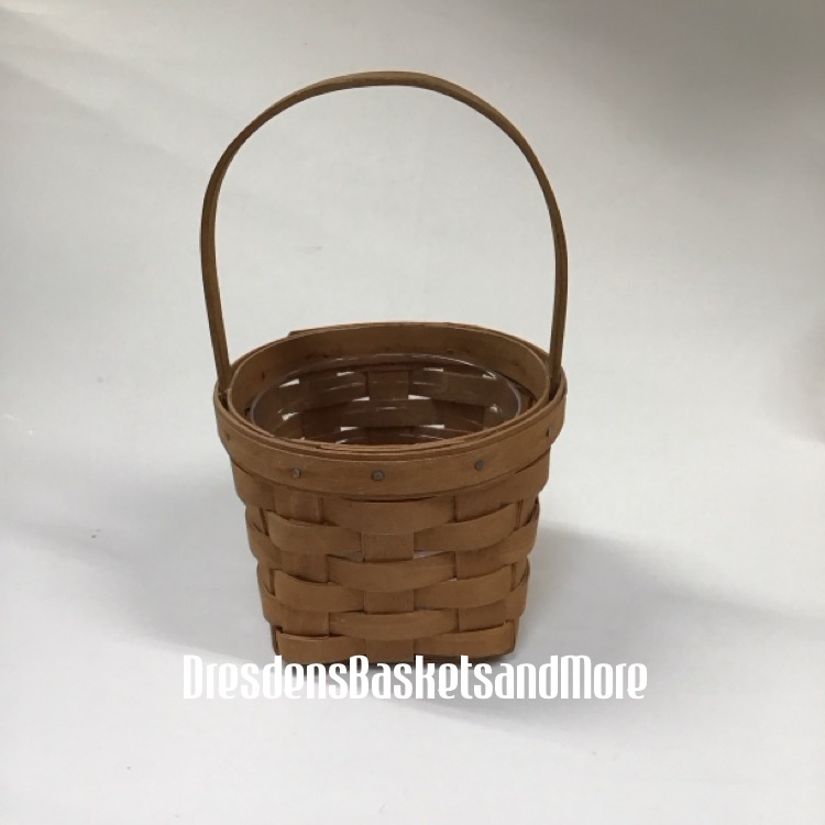 Round opening, square bottom. 1 stationary handle. Woven bottom.