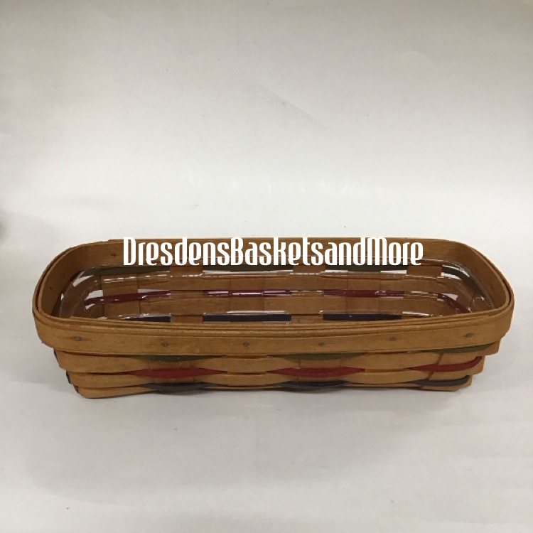 Red, blue, green shoestring weaving. No handles. Includes protector.