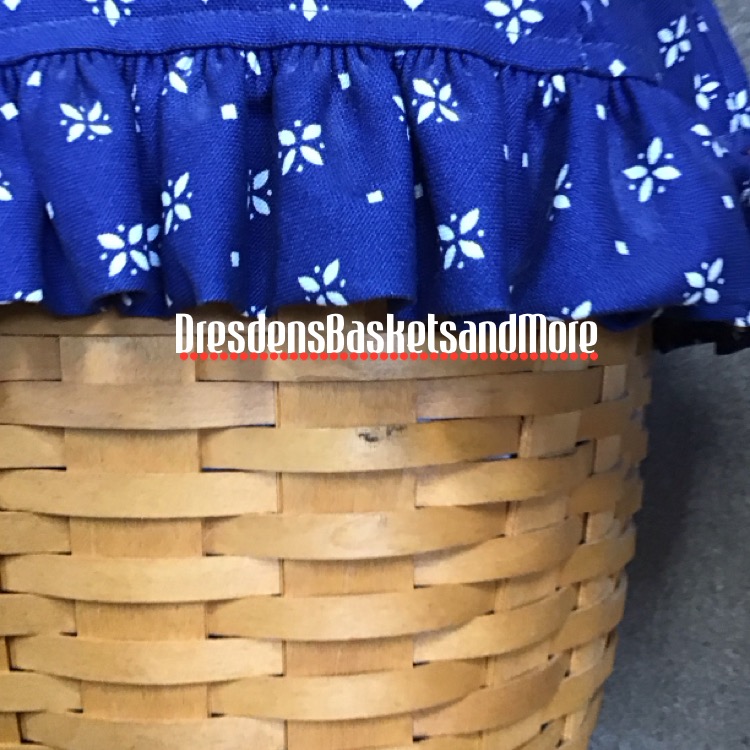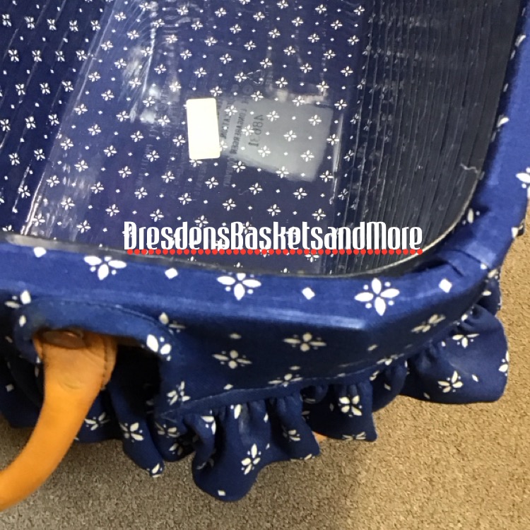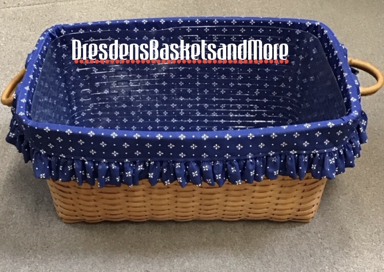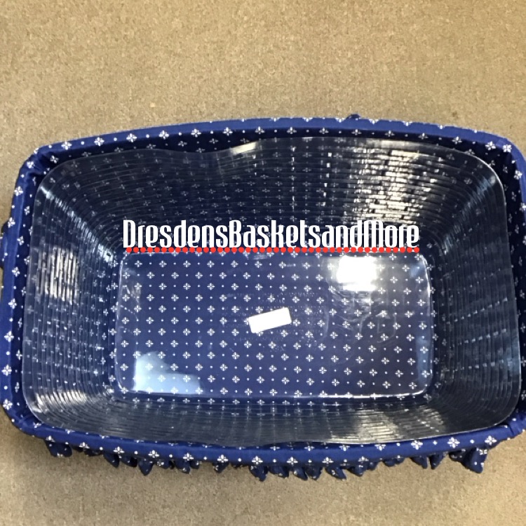 Classic. 2 rolled leather handles. 3/8″ weave. Includes basket, Classic Blue liner and protector.