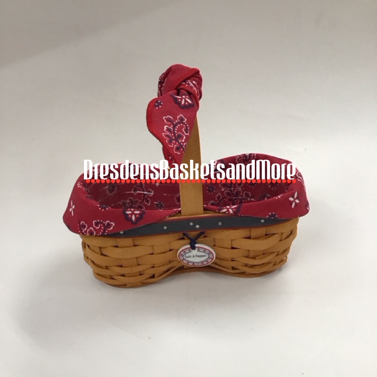 Classic. Red and blue double trim. No tag. 1 stationary handle. Board bottom. 3/8″ weaving. This smaller version was designed to hold Salt & Pepper shakers.