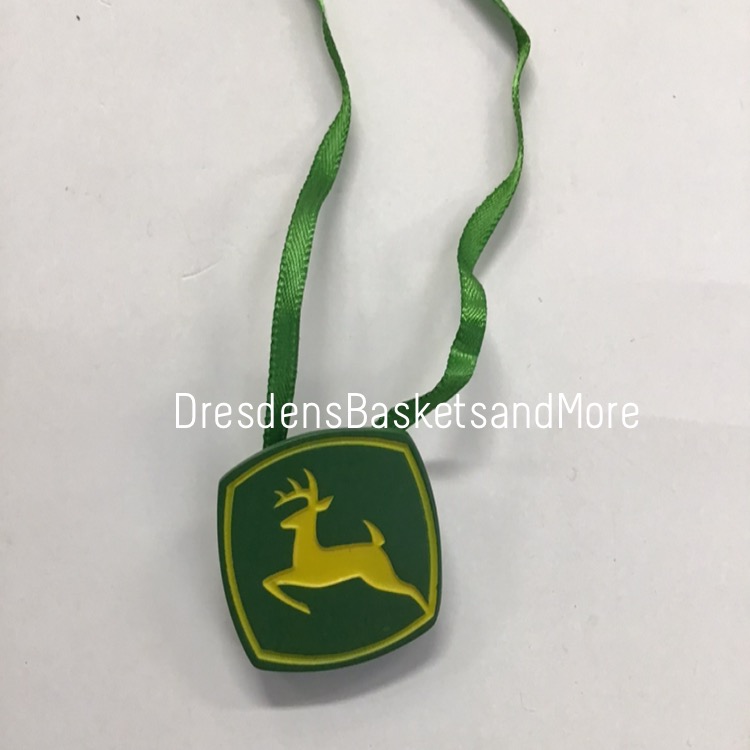 Resin / Enamel. John Deere Running Deer Logo. Green Satin Ribbon.