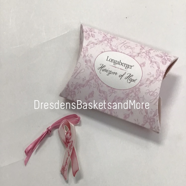 Embossed ceramic with bar pin. Pink ribbon symbol for breast cancer awareness. Words “Horizon of Hope. Pink ribbon. Boxed