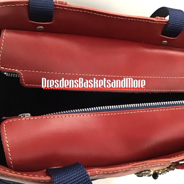 Bright Cornflower Blue upsplints. Navy Blue nylon web weaving. Bold Red leather top. Brushed nickel star button. Zippered closure. Bold Red leather covered bottom. Brushed nickel feet. 2 Navy Blue nylon web handles Bold Red leather hand grips. Longaberger To Go logo embossed on front. *See photos for a couple marks on leather. Includes a So Rachel hanging charm set.