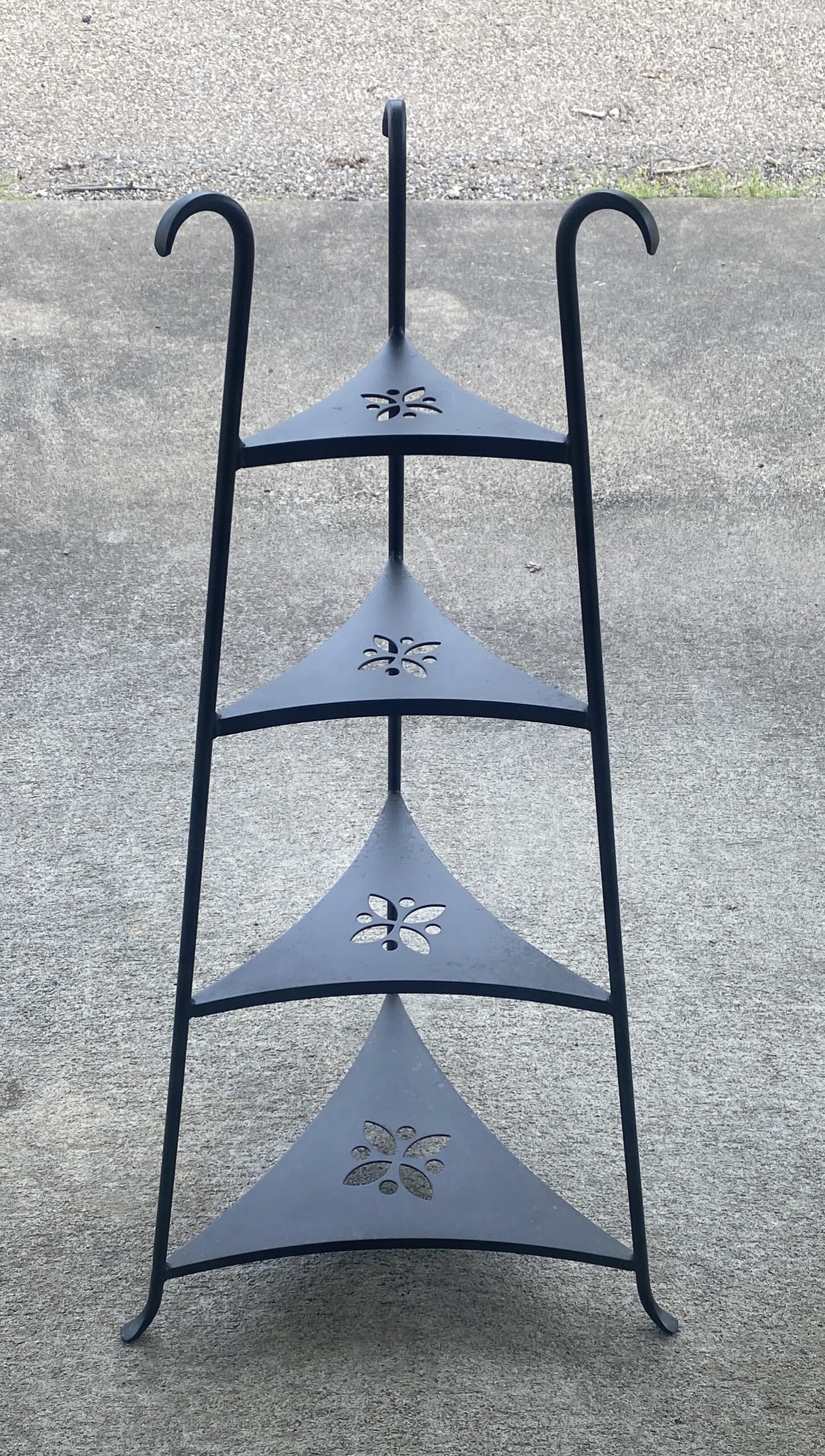Natural Iron Finish. Tripod Design. 4 Triangular Shelves. The stand features four triangular shelves, each shelf cut to scale with the trademark four-petal design. There are 8″ between top and second shelf, 10-3/4″ between second and third shelf, 12-1/4″ between third and bottom shelf with the bottom shelf 3″ from the floor. The recommended weight limit is 50 lbs. per shelf.