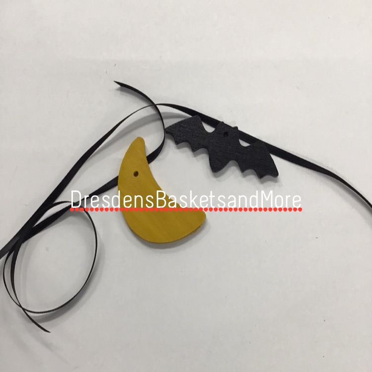 Wood. Yellow half moon, black bat. Includes black satin ribbons. Box.