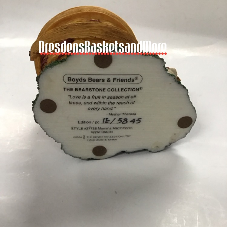 Bear holding apples. Comes with glass votive cup that fits inside basket.