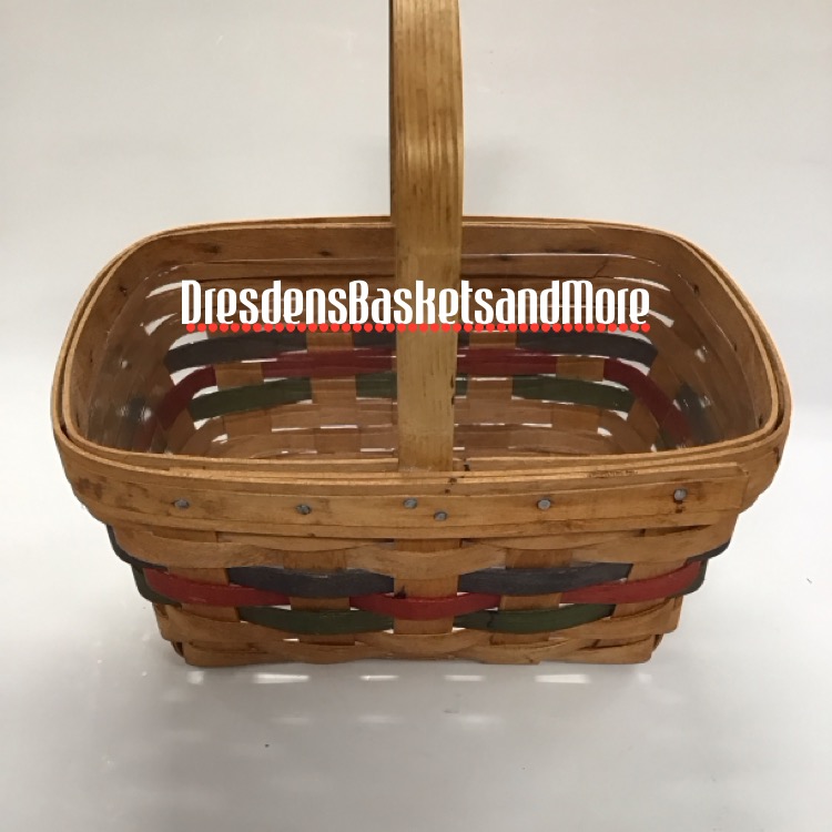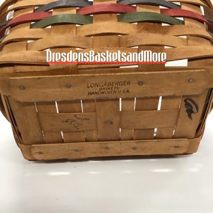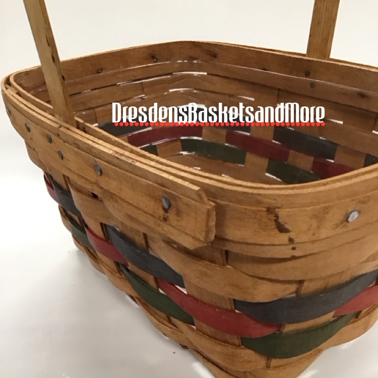 Blue, red, and green weave. 1 stationary handles. Signed by Dave Longaberger. Includes protector. *Basket is in used shape. Please see photos for marks and condition.