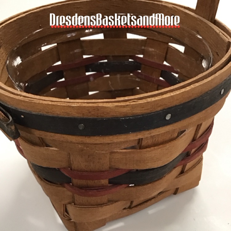 Red and blue weave and trim. 1 stationary handle. Commemorative pewter tag.