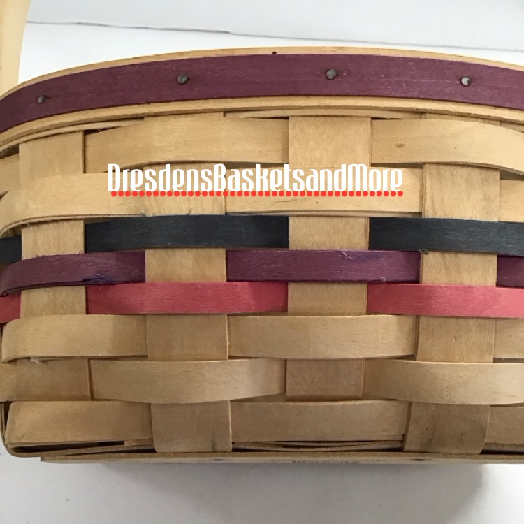 Natural with Dresden blue, violet, and pink weave and violet trim. 1 stationary handle. Includes protector and liner. *See photos for a couple blemishes on basket.