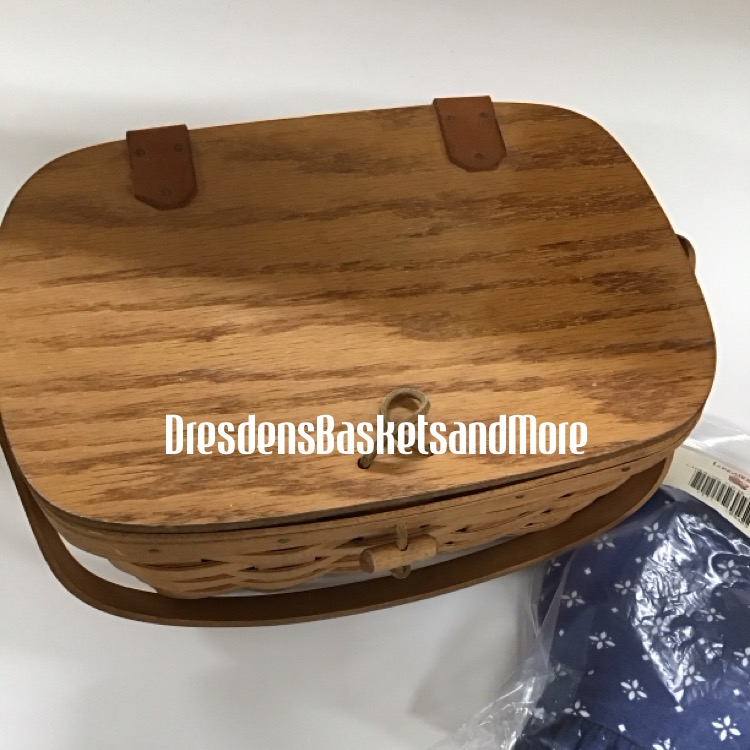 No color weave or trim. 1 swinging handle – lengthwise. Attached Lid. Basket and leather hinges are showing signs of age. *Please see photos. Includes protector and Classic Blue liner.