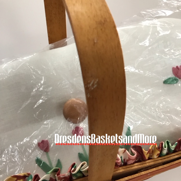 Tulip Red weave and trim. 1 stationary handle. The May Series Baskets are named after Grandma Bonnie’s favorite flowers. Includes basket, liner, protector and custom fabric lid. *See photo for scuffs.