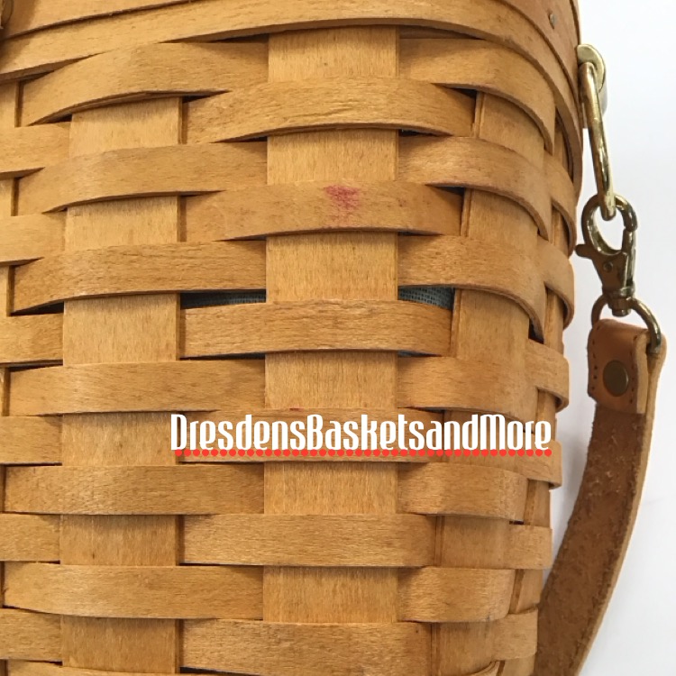 No color weave and trim. Reinforced board bottom. Natural color leather strap and latch. Solid brass latch and tacks. 3/8″ weave. Includes protector and Heritage Green liner. *Basket has some wear. Please see photos for marks.