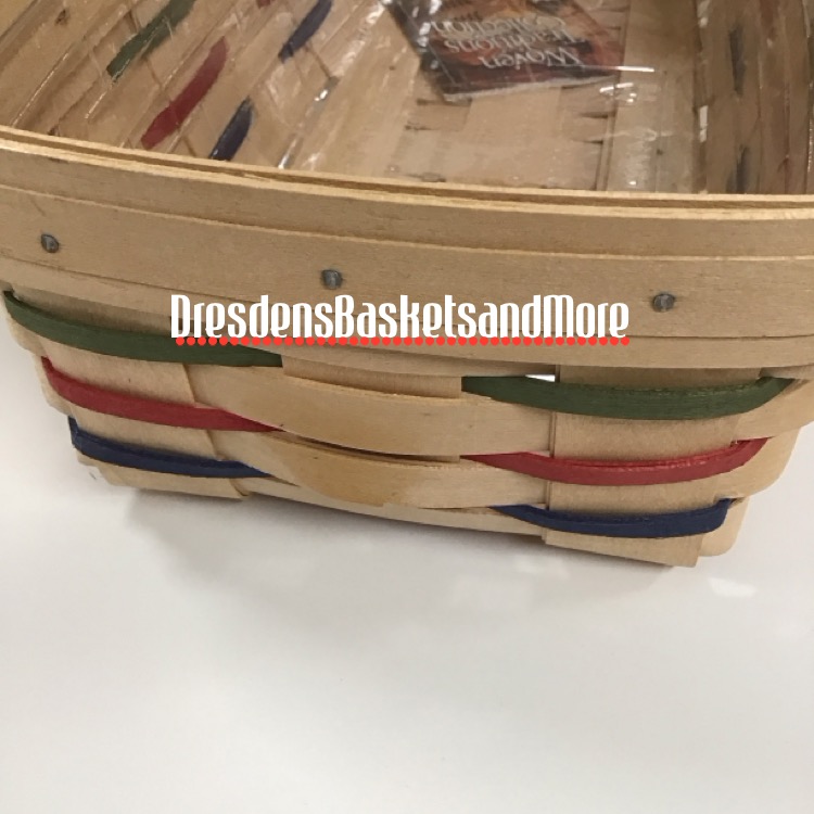 Natural with Red, blue, green shoestring weaving. No handles. Includes protector.