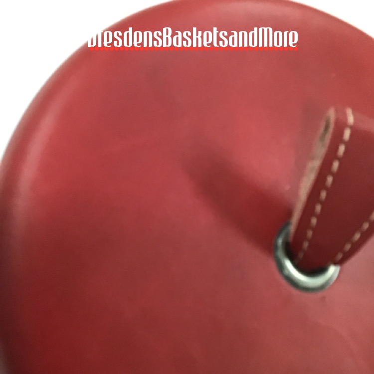 Warm Brown. No handles. Solid Wood Bottom with burned in Mother’s Day logo. Includes basket, Market Stripe liner, divided protector, leather lid and mirror tie on. *Leather lid has a few marks on top.