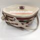 Warm Brown. Red Trim w/Rose Tack. 1 swinging handle. Tournament of Roses Logo on Bottom. Mixed Weaving.