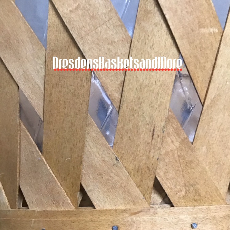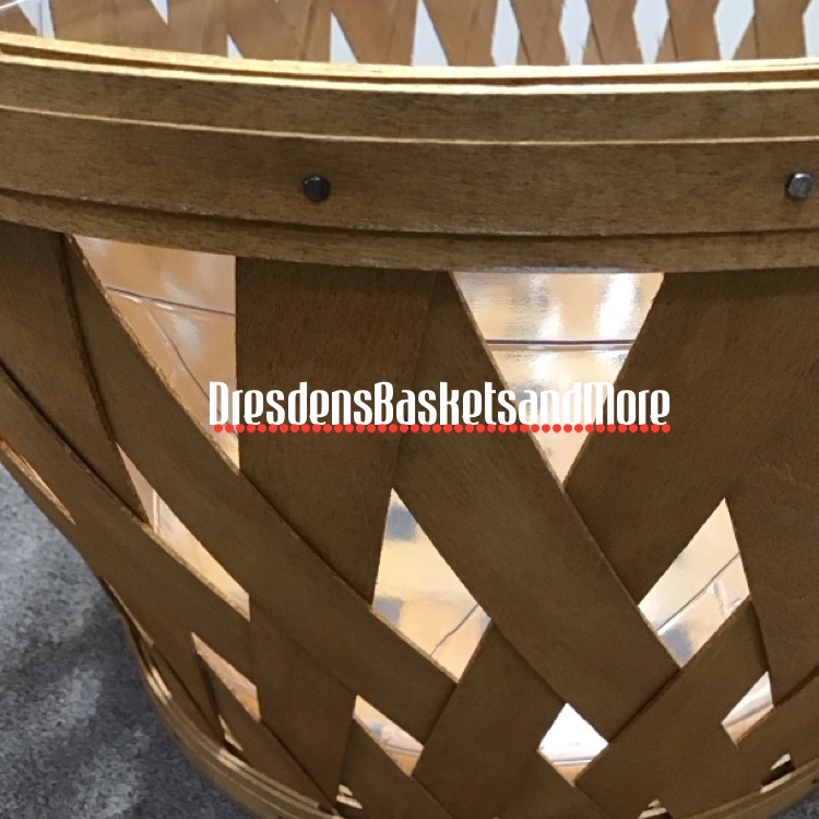 Warm Brown. 2 Leather handles. Open Lattice Inverted Bottom. 1-3/16″ Weave. Includes basket and protector. *See photos for a few scuffs on basket and a few scratches on protector.