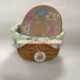 1 Sunset Pink swinging handle. 1/2″ Natural weaving with Sunset Pink, Sky Blue and Leaf Green upsplints. Sky Blue trim. Reinforced Bottom.