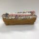 Deep Brown stain. Reinforced outside bottom, inside board bottom. 1/2″ Weave. Two braided leather handles.