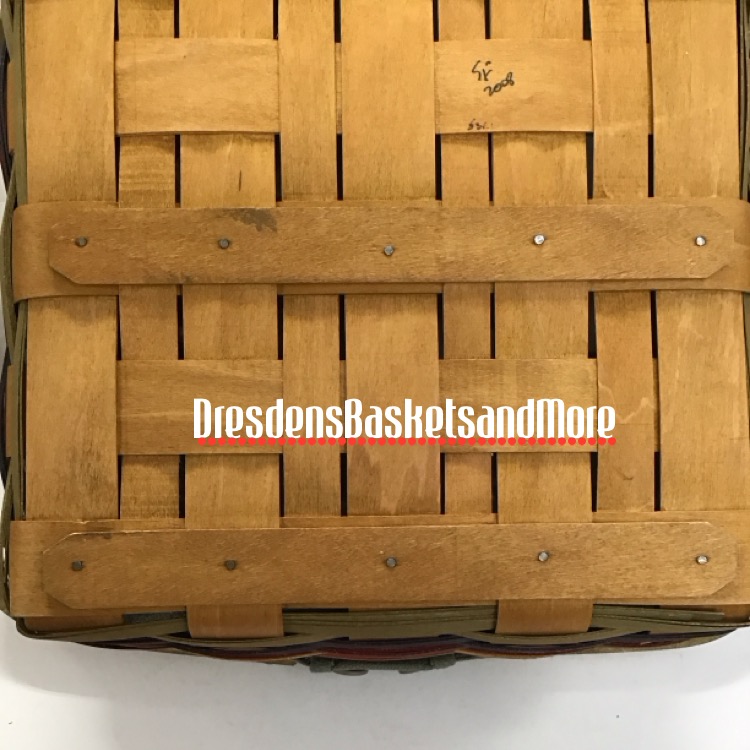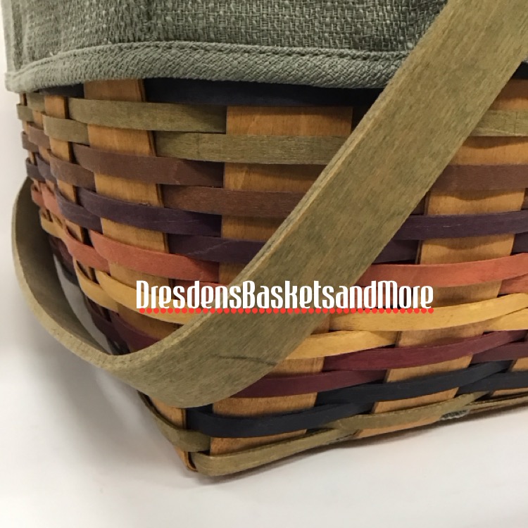 Multi-color weave: Sage, Collectors Club Blue, Deep Red, Maple Leaf Yellow, Maple Leaf Orange, Purple and Rich Brown. 2 Sage swinging handles. Reinforced bottom. Warm Brown riser.