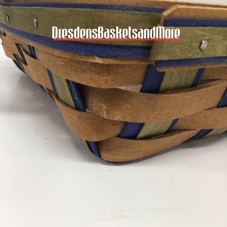 Warm Brown accented with Leaf Green over Bright Cornflower upsplints and trim band. Reinforced outside bottom, inside board bottom. 1/2″ Weave. Two braided leather handles.