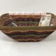 Diamond shape with bottom flaring out, oval top. Grey Brown upsplints. Rich Brown and Warm Brown accent weave. Warm Brown and Black double trim strip. No handles. No tag. Woven bottom.