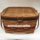 Rectangular. Grey Brown upsplints. Rich Brown and Warm Brown accent weave. Warm Brown and Black double trim strip. 2 cut-in handles at sides. No tag. Reinforced bottom. Includes basket, Autumn Path liner and protector.