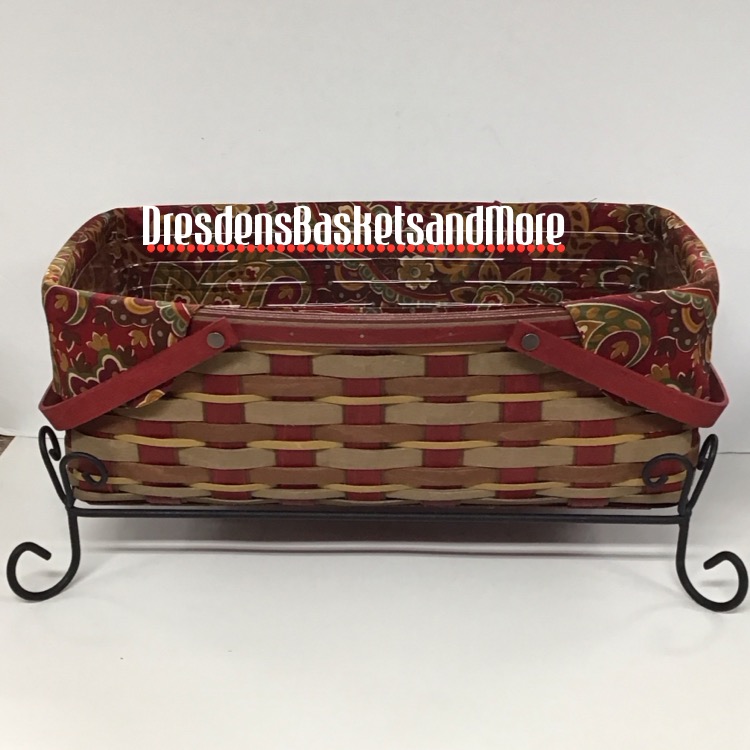 Rich Brown weaving, Bold Red and Warm Grey double upsplints. Combination of Merlot, Rich Brown and Deep Gold accent weave. Reinforced woven bottom with fillers. Includes protector, Crimson Hill liner and custom wrought iron stand.