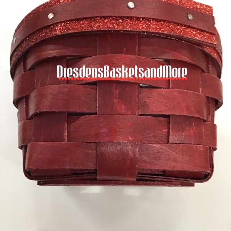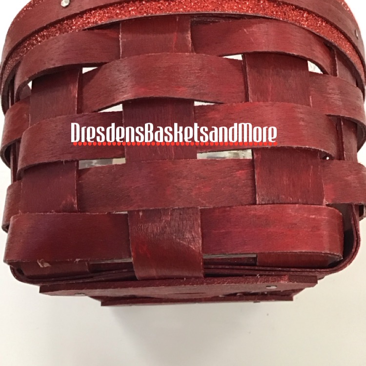 Bold Red splints and weaving. Red over Red Glitter trim strip. Solid green tree atop solid red lid. No handles. No tag. Round opening, reinforced square bottom. *A few blemishes in the red stain. Please see photos.