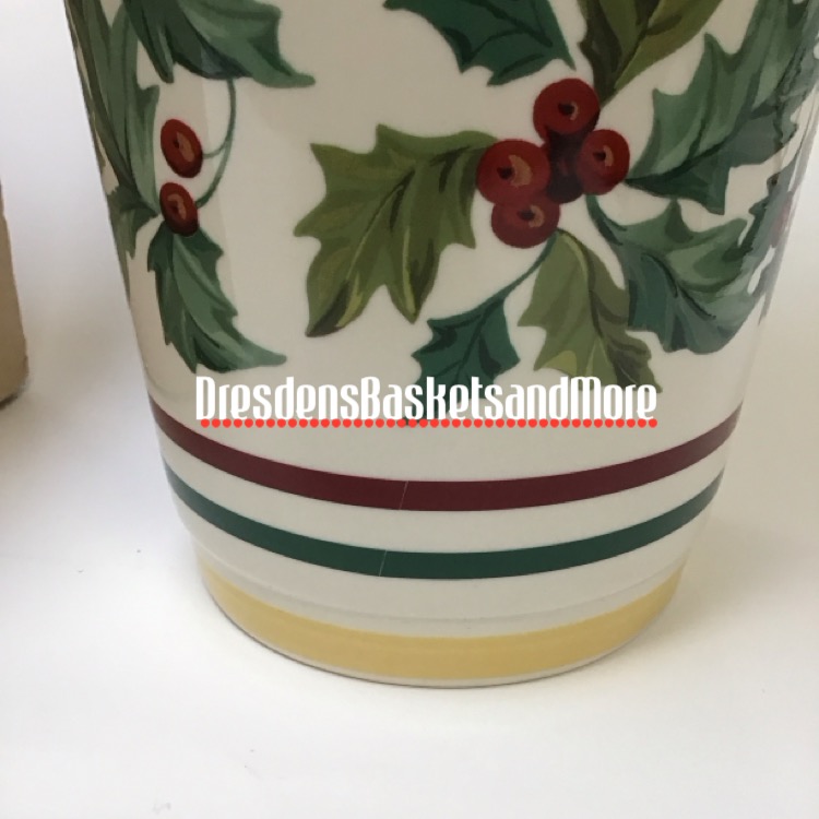 Vitrified China. White background. Holly leaves in soft shades of green. Red holly berries. Butternut trim top and bottom. Box. *Please see photo for where the lines come together on the stripes.