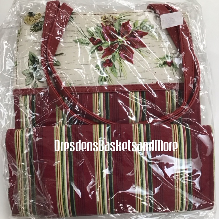 Longaberger Holiday Tote Bag. Holiday Botanical/Holiday Stripe. 2 red leather handles.