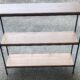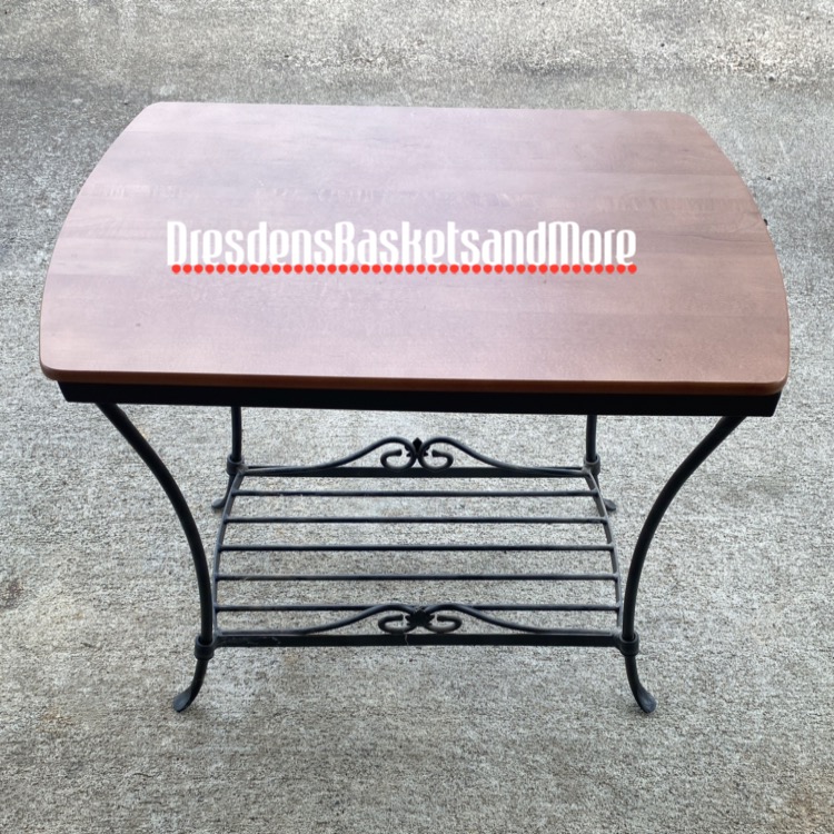 Black Wrought Iron has maple leaf and scroll design and coordinates with other wrought iron pieces. Features hand forged feet for stability. Equipped with rubber pads on the rim where WoodCrafts Shelf sits for added protection. Bottom shelf measures 19L X 9.5W and has rolled bars to accommodate various baskets. Includes Rich Brown Woodcrafts shelf. ***Shelf has scratches. Please see photo.