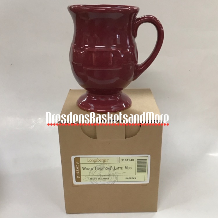 Curved shape. Features sturdy pedestal base. Woven Traditions design encircles the Latte Mug. Embossed Longaberger logo on bottom. New in box.