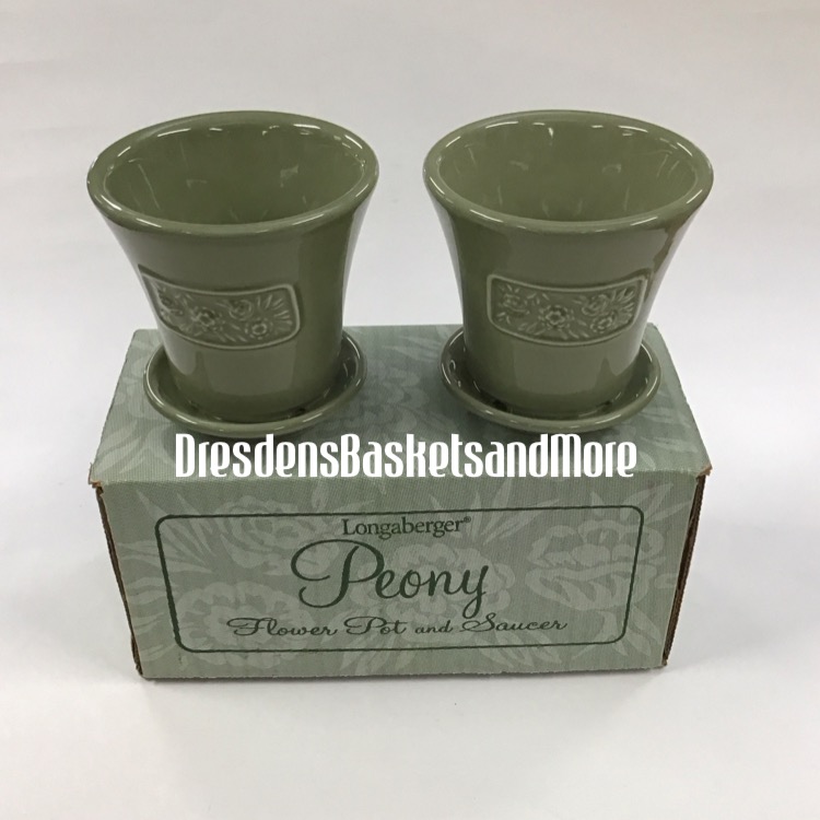 Solid sage green color. Saucer is permanently attached to the pot during the glazing and firing process. Pots drain to saucer through five small holes at base of pot. Sold in set of two. Note solid color glaze shows scratches mores readily than clear glaze. New in box.